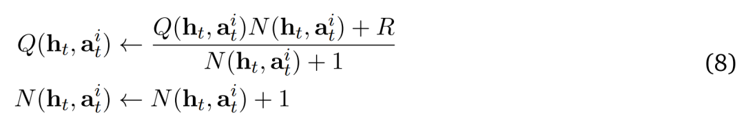 扩展和回溯。研究者在浏览器环境中选择并执行一个操作以到达一个新节点(页面)。从选定的状态节点轨迹开始,他们使用当前策略 𝜋_𝜃 展开轨迹,直到到达终止状态。环境在轨迹结束时返回奖励 𝑅,其中如果智能体成功则 𝑅 = 1,否则 𝑅 = 0。接下来,通过从叶节点到根节点自下而上地更新每个节点的值来反向传播此奖励,如下所示: