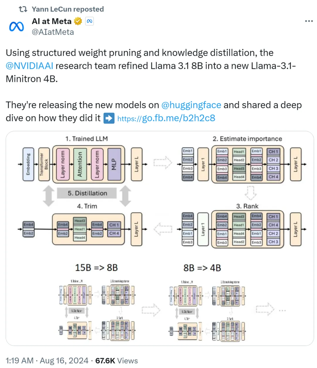 经过剪枝和蒸馏,英伟达研究团队将 Llama 3.1 8B 提炼为 Llama-3.1-Minitron 4B 开源了出来。这是英伟达在 Llama 3.1 开源系列中的第一个作品。
