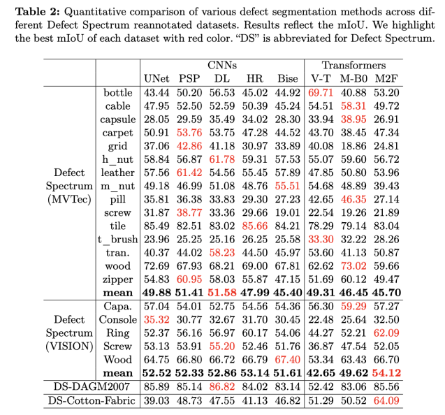 部分缺陷检测网络在 Defect Spectrum 数据集上的测评结果