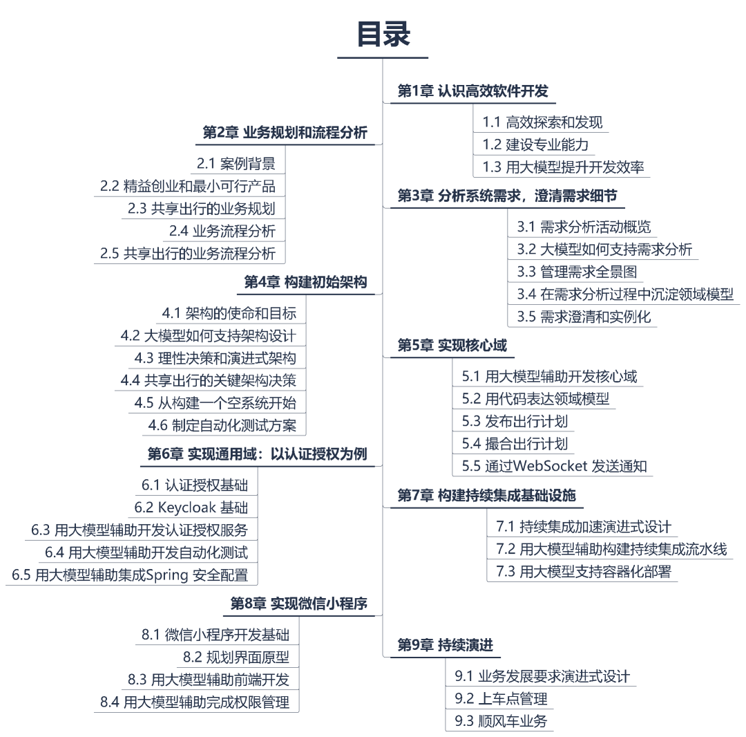 书中内容围绕一个真实的案例展开,介绍如何基于坚实的专业基础,借助大模型,实现从业务探索、需求分析、架构设计、编码实现到上线运行的完整过程,展示了大模型支持端到端软件开发的可行性。全书共 9 章,围绕软件开发的生命周期组织。