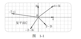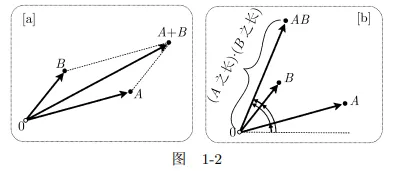 注意, 这与图 1-1 是相容的, 因为(举例来说)4 + 3i 确实是 4 与 3i 之和.图 1-2b 画出了不那么明显的乘法法则:
