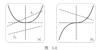 例如,(1.3) 可以看成求抛物线 y = x2 与直线 y = mx + c 的交点. 见图 1-3a.