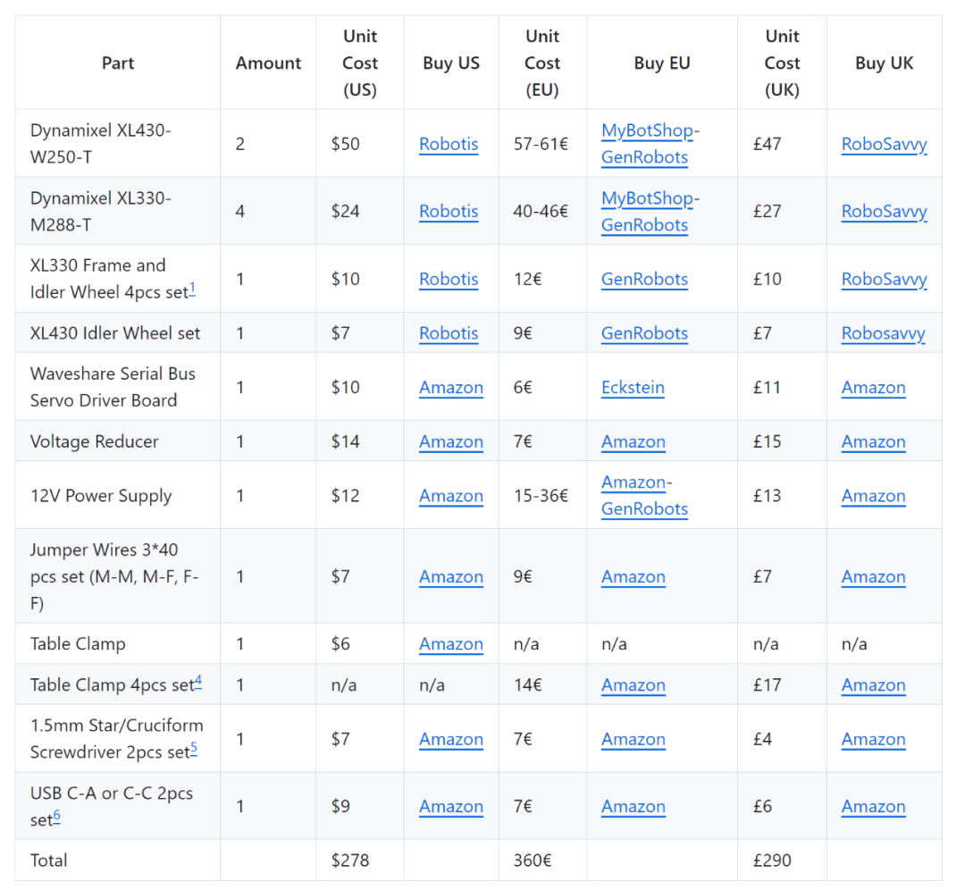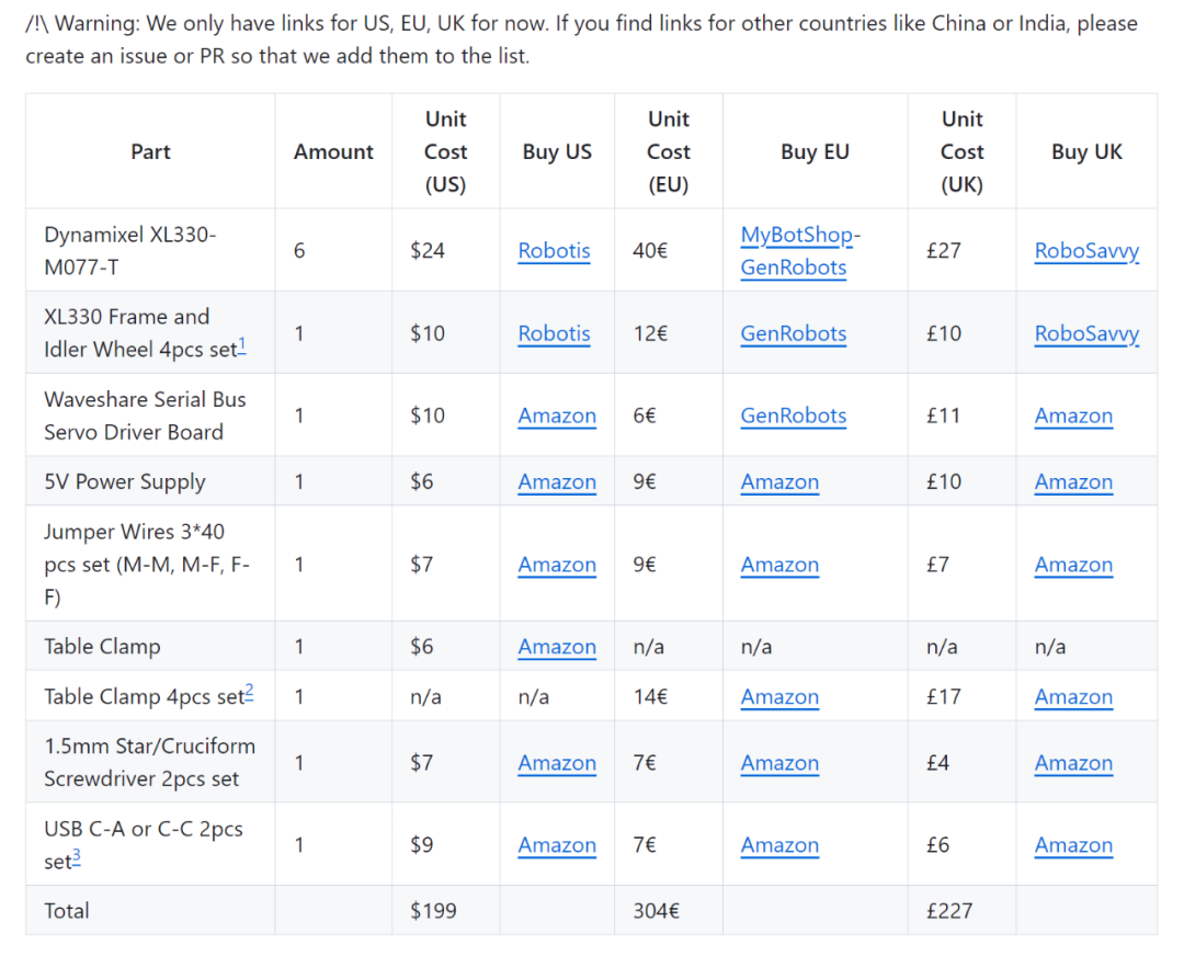 这个页面上包含一个详细的零件采购清单(作者表示,目前他们只找到了美国、欧盟和英国的购买链接,如果读者可以找到中国、印度等其他国家的购买链接,欢迎补充进去):