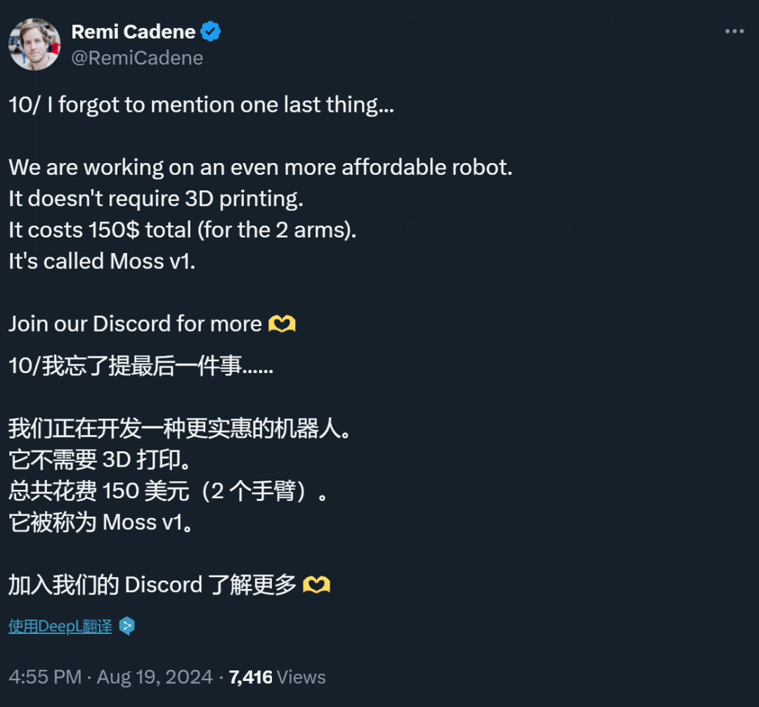 Cadene 透露,他们正在开发一款更实惠的机器人。这款机器人不需要 3D 打印,总共花费 150 美元(2 个机械臂)名叫 Moss V1。