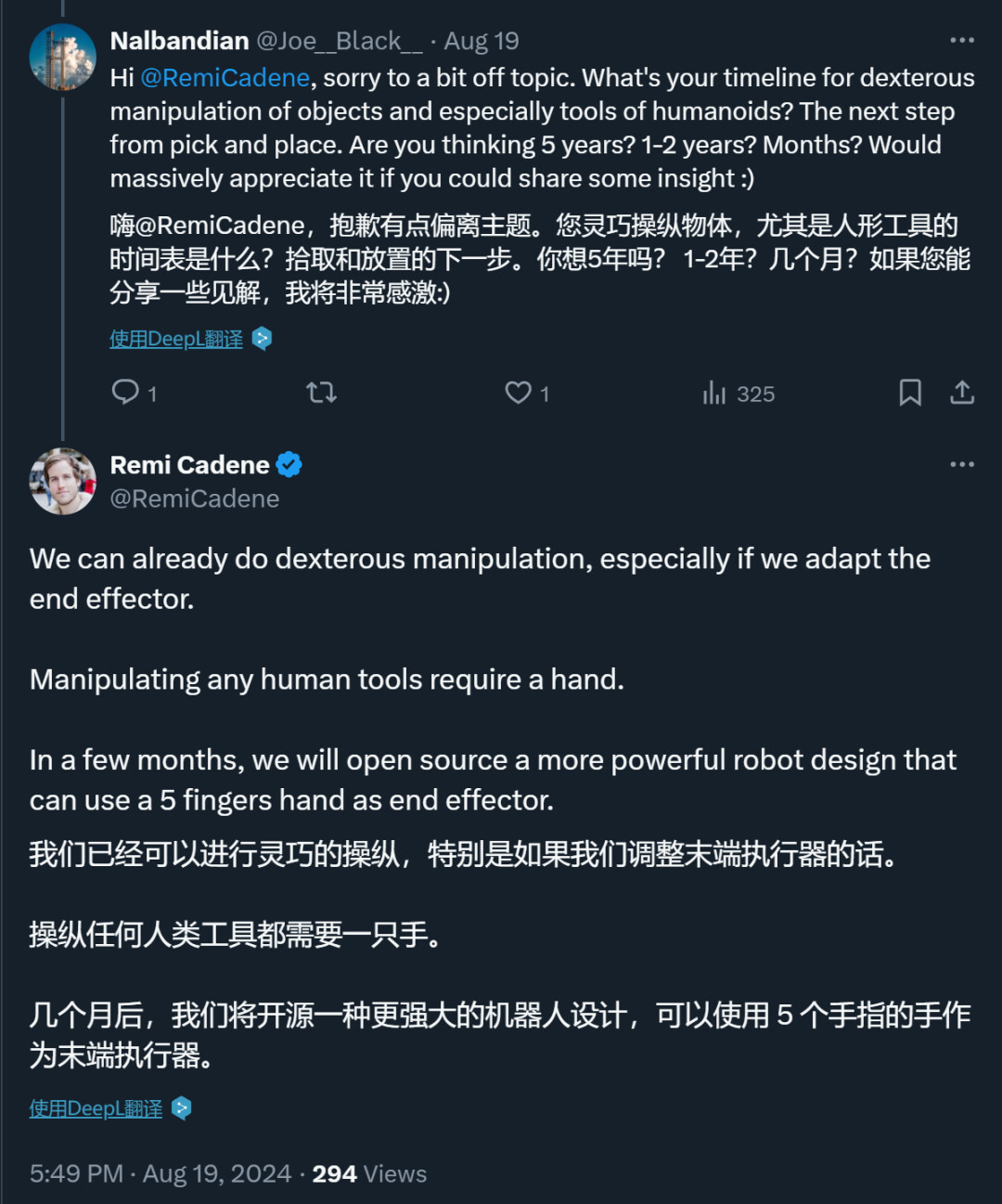 此外,他们还将开源一款更强大的机器人,这个机器人可以使用 5 个手指的手作为末端执行器。
