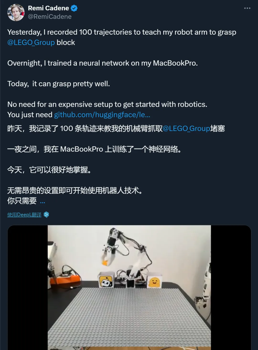 靠 100 条轨迹数据,在 Mac 上训练几个小时,就能拥有一个可以抓取乐高积木的机械臂,这是 HuggingFace 机器人科学家 Remi Cadene 晒出的一个实例。机器人的门槛可能并没有想象中那么高。