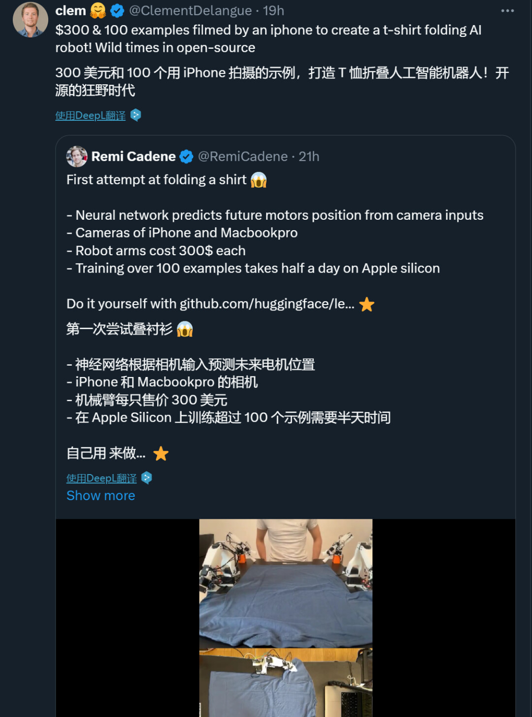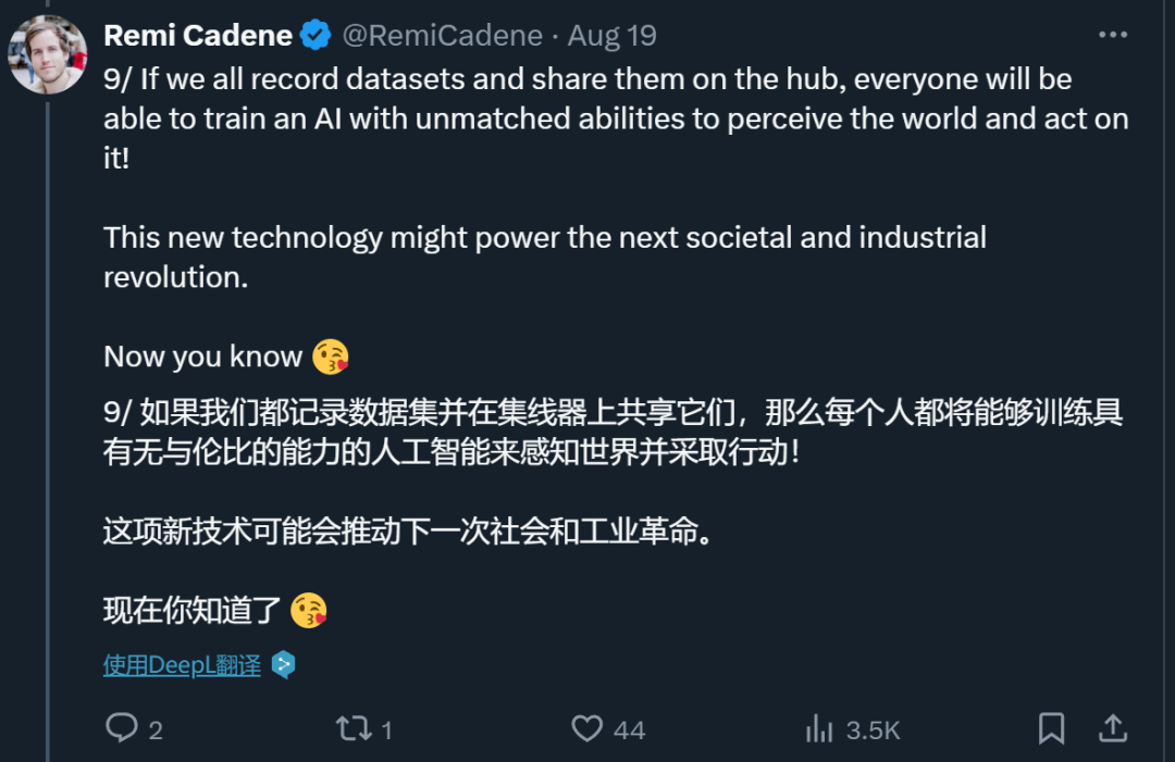 Remi Cadene 之前是特斯拉人形机器人 Optimus(擎天柱)项目的成员,3 月份被挖去 HuggingFace,领导一个新的开源机器人项目 ——LeRobot,当时引发了一些轰动。