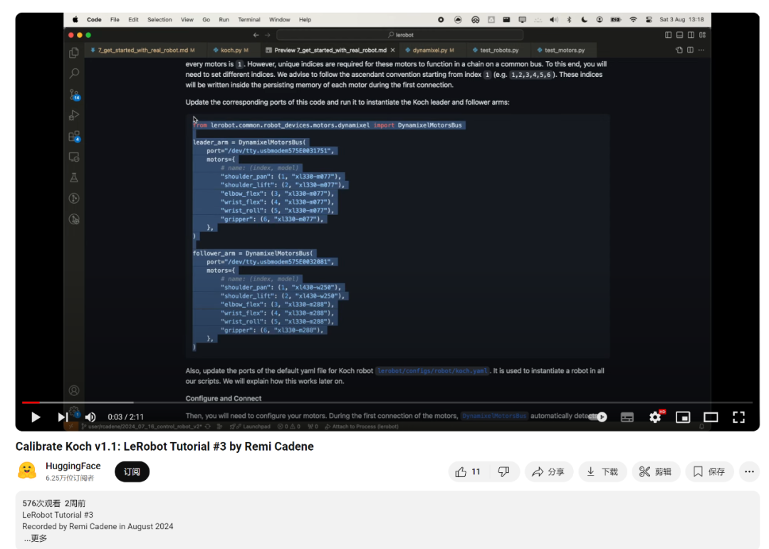 该教程主要基于一种开源、价格友好的机器人套件 Koch v1.1 编写,不过也可以通过改变配置轻松适应各种类型的机器人。