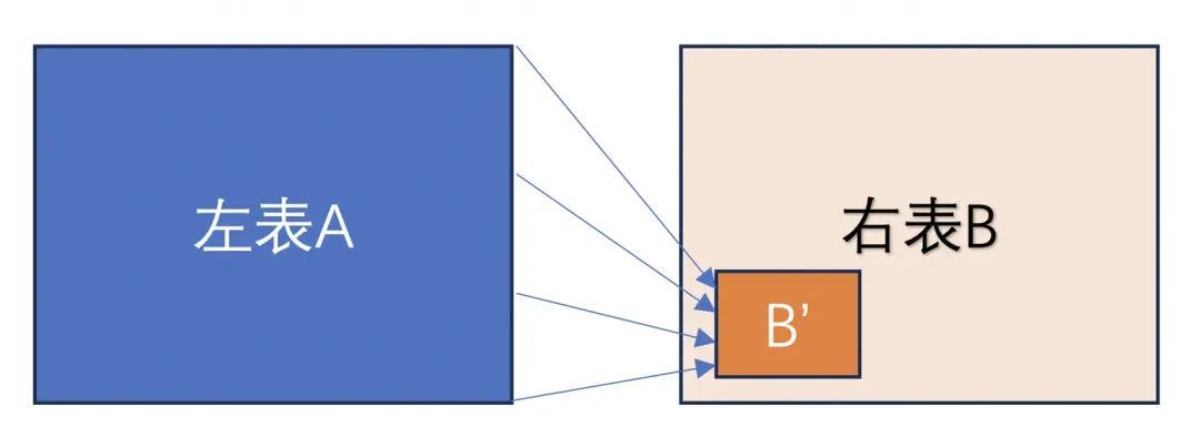 全量标签表B中只有一小部分B'实际关联到了左表A