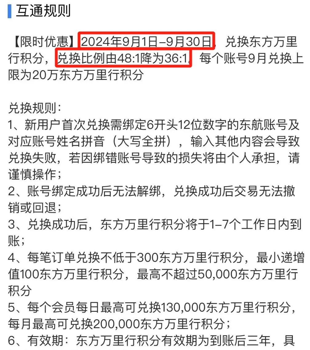 还是平安万里通积分的玩法,9.1-9.30期间有兑换优惠,万里通积分兑换东航里程的比例由48:1降至36:1。按照某宝购买万里通积分的成本来算,720万万里通积分可以兑换20万东航里程,平均每万东航里程的获取为690元。
