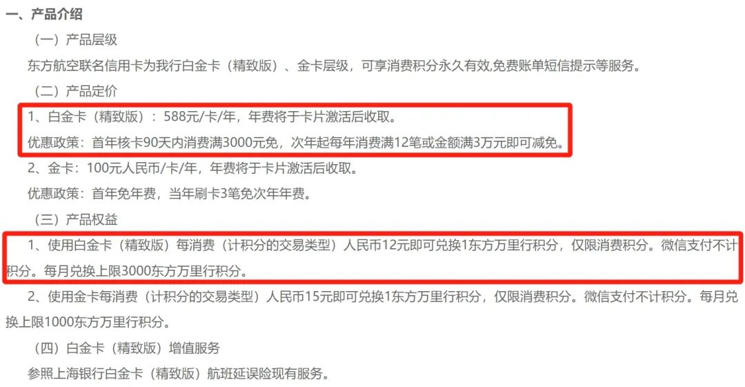 - 消费 12:1 累积东航里程,月上限 3000 里程,年上限 3.6 万里程。