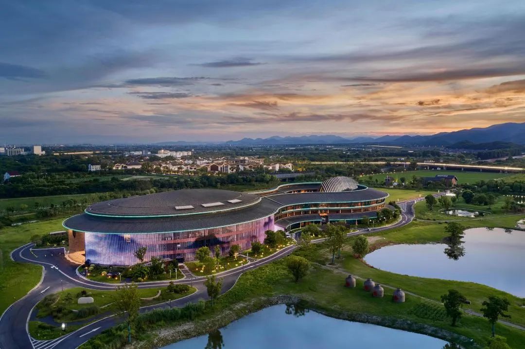 酒店位于浙江湖州,其外形设计灵感来源于蚕茧,从空中鸟瞰,宛如代表着融合的莫比乌斯环。