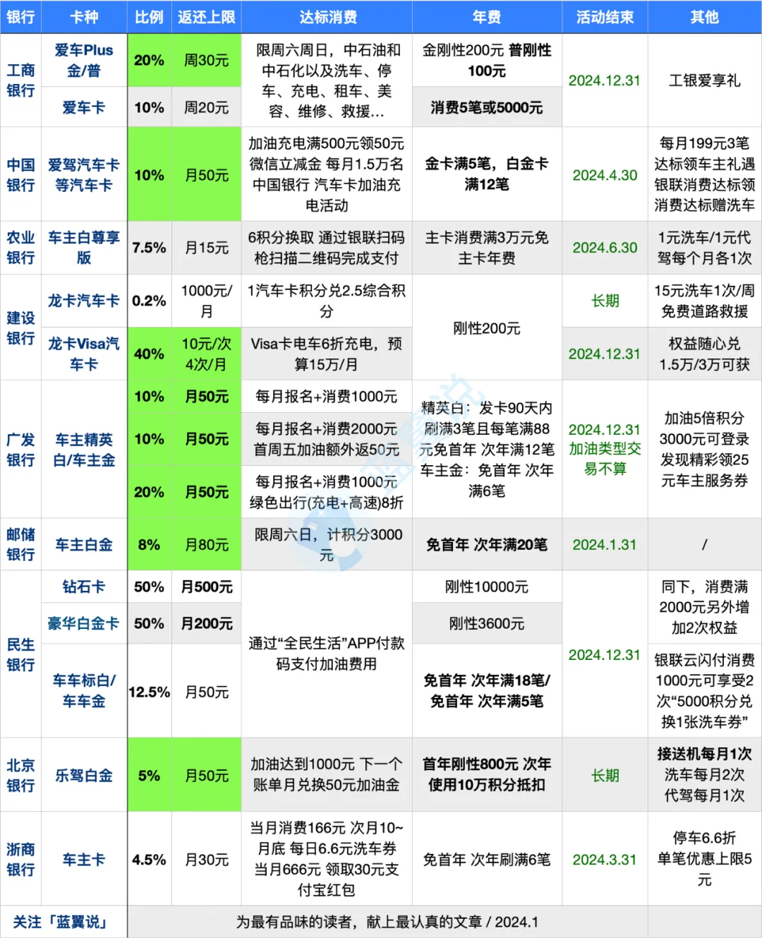 邮储:分为白金/金/普卡,蓝翼只建议你去申白金,因为卡的等级决定你返现的比例;这和工行的爱车 Plus 完全不同啊……同时大家需要注意:邮储的加油只续到 2024.1.31,不过按照邮储的惯例,应该会续吧。
