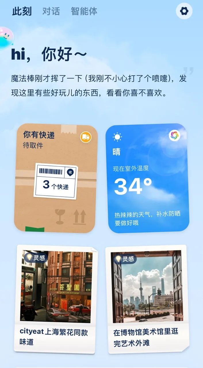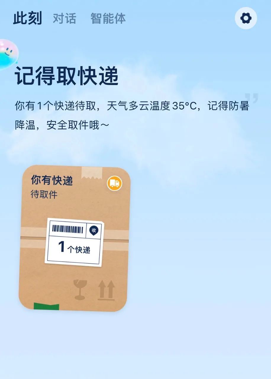 TA 就像一个聪明的公告栏,实时将 To-do list 事项更新至此。除了实时更新的天气和新闻,快到地铁站了,乘车码会自动冒出来;快递到了,取件码会被贴在首页。如果你在黄山,请出「智能体」里的「黄小松」就能获得更地道的本地服务。