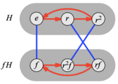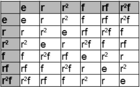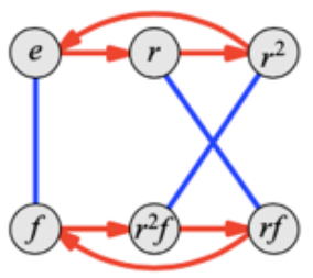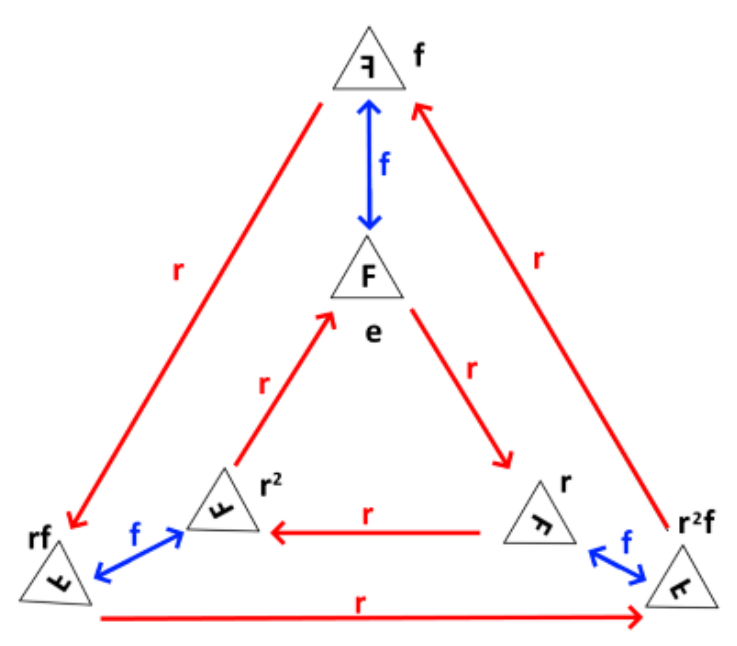 其中 代表旋转 , 代表翻转。注意, 和 是不同的,可以通过画图来检验。这代表 是不可交换的(非阿贝尔群)。