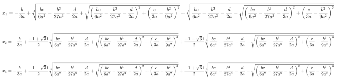 十六世纪的数学家尼科洛·塔尔塔利亚首先得到了通用的公式,我们就把它列出来看看有多复杂