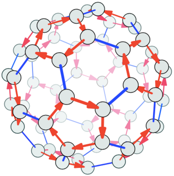 事实上,这种每个局部小多边形都尽量与其他小多边形连接的结构,会使整体结构非常稳定而坚固,对群除法这种结构拆解工作自然就不够友好。神奇的是,如果在上图中的每个圆圈处放一个碳原子,它们将组成稳定的足球形分子“巴基球”,这个名字来源于建筑学家巴克明斯特·富勒,此人建造了世界上最大的足球形建筑物。