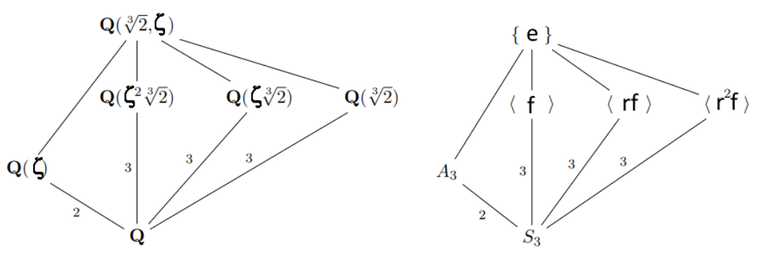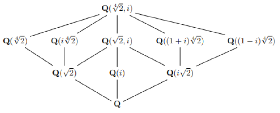 这似乎太巧了:子群的结构和域扩张的结构完全相同。而这并不是巧合。再来一个例子:下图是域扩张 和它的伽罗瓦群 ( 相当于是正方形旋转翻转的对称群)