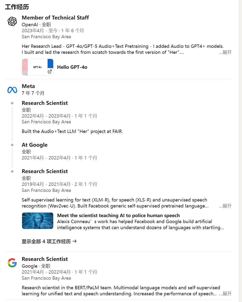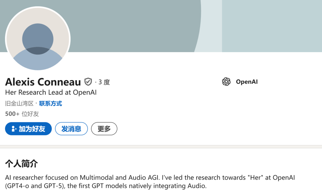 此次离职的 Alexis Conneau 就是 GPT-4o 项目的关键人物之一。离职前,他是 OpenAI 音频 AGI 研究负责人,也是 OpenAI 最早提出 Her 愿景的人。他在领英的个人简介中写道,他是「专注于多模态和音频 AGI 的人工智能研究员,在 OpenAI 领导了『Her』的研究(GPT4-o 和 GPT-5),这是首个原生集成音频的 GPT 模型。」