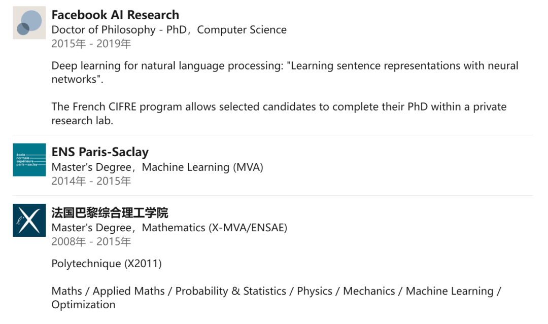 Alexis Conneau 本科毕业于巴黎综合理工学院(法国的工程师大学,在法国各类院校中常年排名第一),也在该校拿到了硕士学位。之后,他又获得了巴黎 - 萨克雷高等师范学校的机器学习硕士学位。这一阶段,他打好了数学和计算机科学的教育基础。