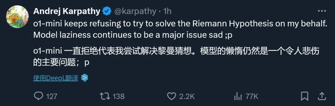 虽然 o1 很强,但有趣的是,它并不会尝试去推理和解答「黎曼猜想」这类人类自己还没解决的难题,以至于 Andrej Karpathy 忍不住吐嘈说它很懒。