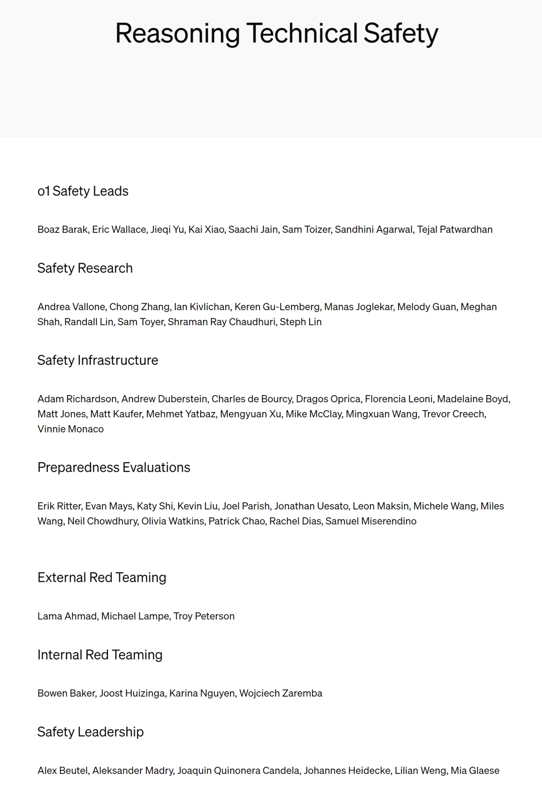 在「推理技术安全」版块,OpenAI 列出了与新模型相关的贡献者。除了 Lilian Weng,里面还有很多其他华人科学家的身影。其中担任领导职位(o1 Safety Leads 和 Safety Leadership)的包括: