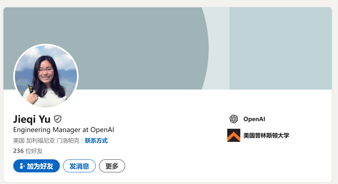 Jieqi Yu 是 OpenAI 的工程经理,2023 年 8 月加入 OpenAI。