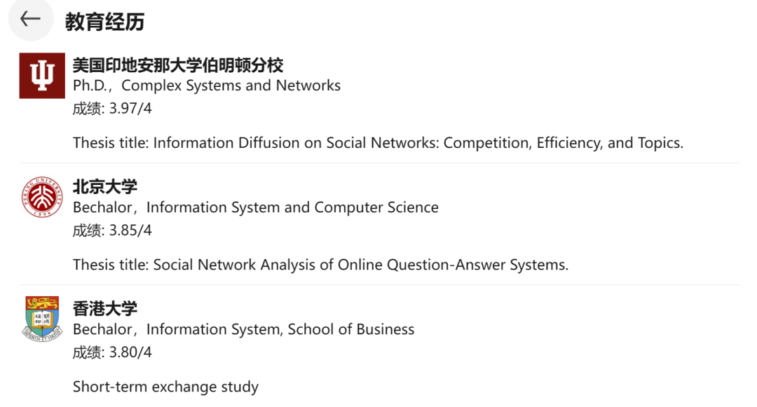 她本科毕业于北京大学信息系统与计算机科学专业,曾前往香港大学进行短期交流,之后在印第安纳大学布鲁明顿分校(Indiana University Bloomington)获得博士学位。