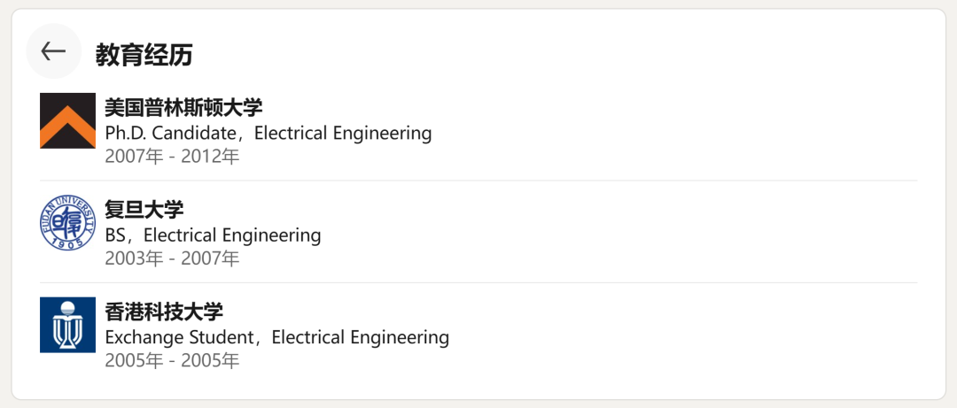 她本科毕业于复旦大学,期间曾在香港科技大学短暂交流,2012 年在美国普林斯顿大学拿到电气工程博士学位。
