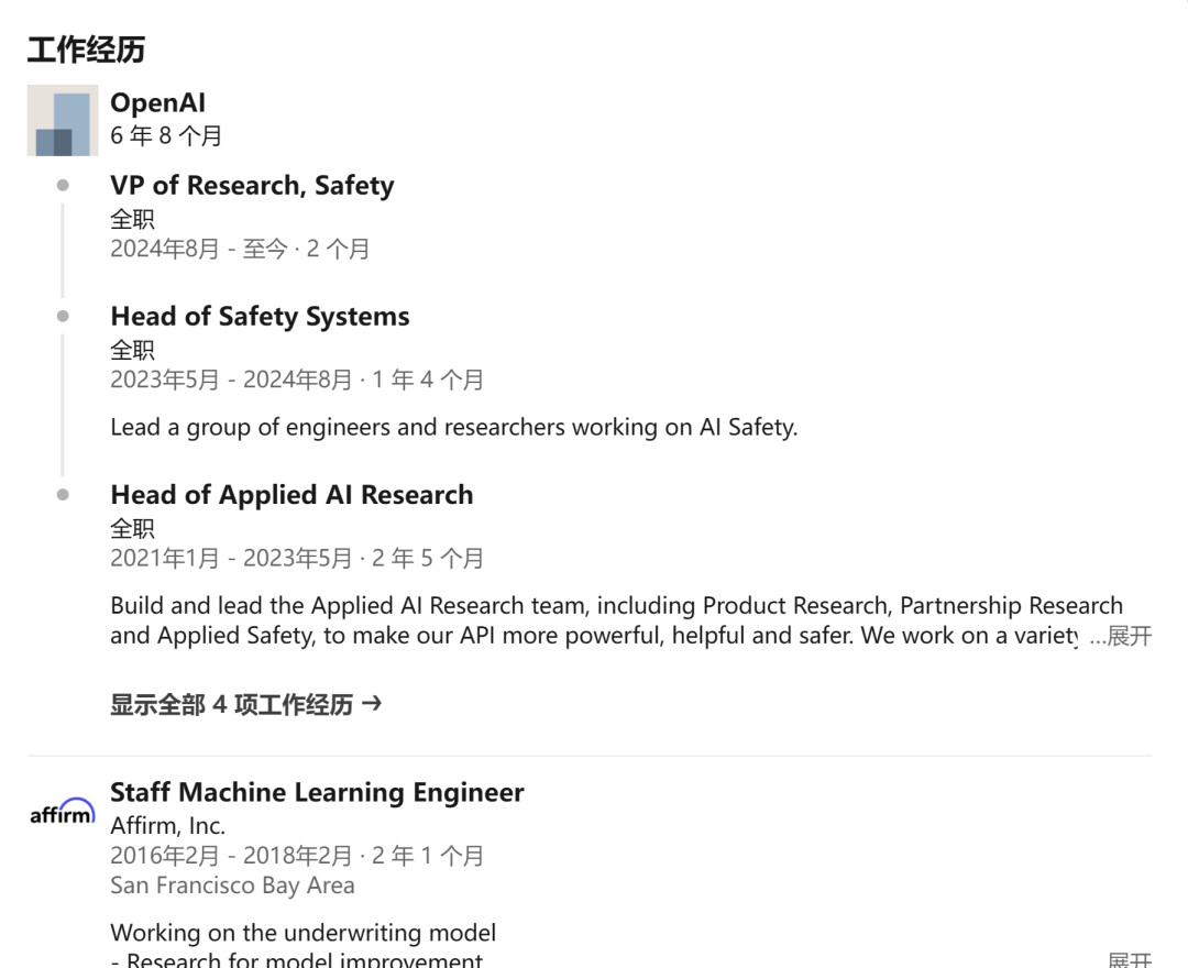 她 2018 年加入 OpenAI,参与了 GPT-4 项目的预训练、强化学习 & 对齐、模型安全等方面的工作。