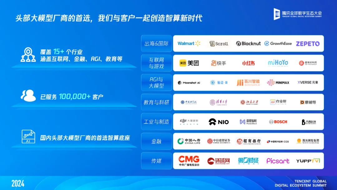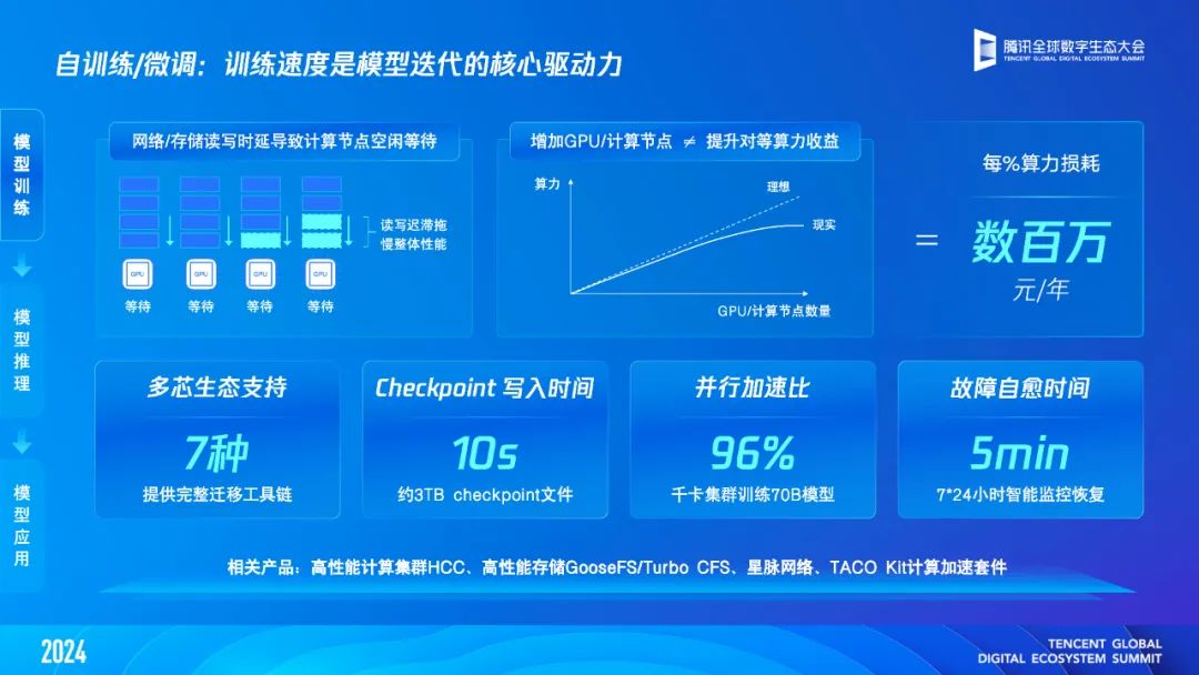 据介绍,“腾讯云智算”是业内首个“经 90% 大模型用户选择、产业深度实践、公私一体化”的 AI 原生云智算超级底座,在 AI 高性能计算、AI 高性能存储、AI 高性能网络、AI 加速套件、云原生智能调度编排、多模态 RAG 数据检索方面进行了系统性优化与创新,打破了算存网的“木桶”效应,为大模型产业发展提供性能 & 性价比双料领先的高效能智能算力,承载海量数据的处理、超大规模的训练与推理,进而加速 Gen AI 应用创新与落地。