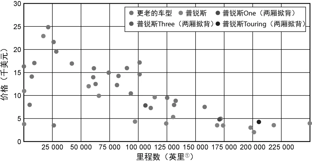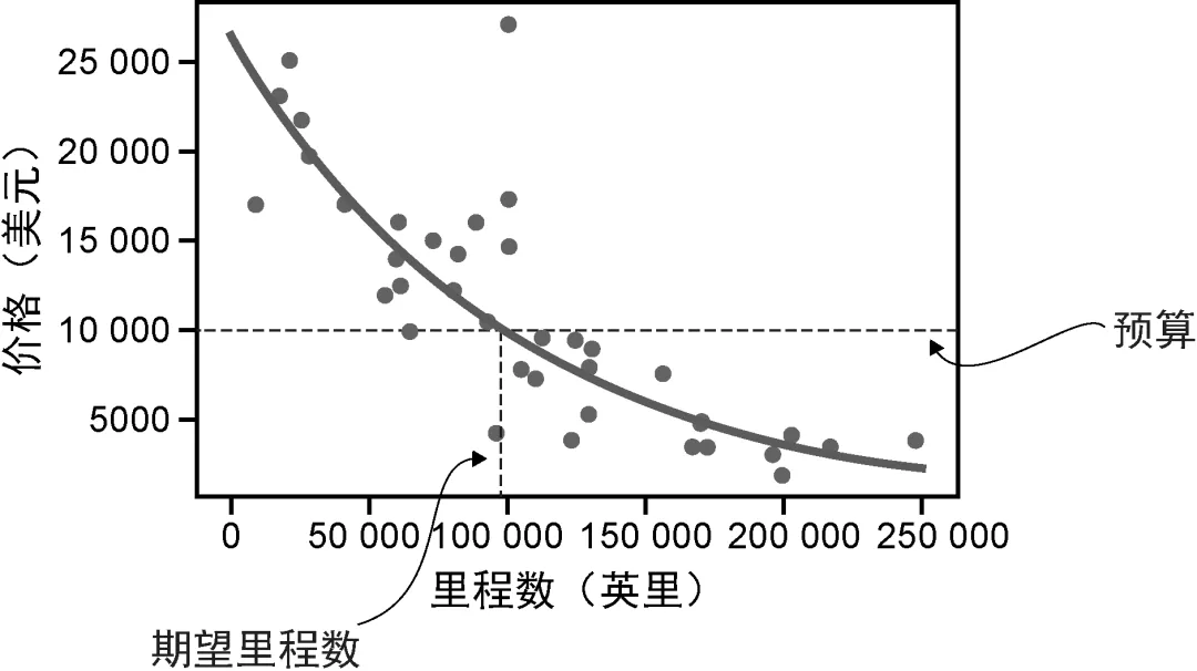 图1-6 以10 000美元的预算为例,找出一辆二手普锐斯的预期里程数