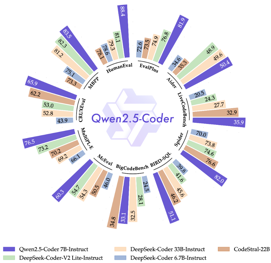 这样的应用体验,离不开基础大模型能力的提升。在阿里云昨天上午发布的通义千问 Qwen 2.5 系列模型中,就包括一个针对编程任务微调的模型 Qwen2.5-Coder(目前有 1.5B 和 7B 版,即将推出 32B 版),其在多项评估基准上都取得了卓越表现。