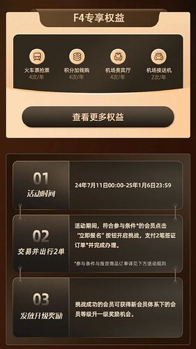 - 报名F4挑战:支付并完成两笔签证订单即可升级。