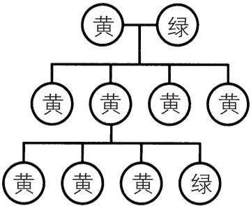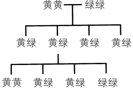 在下一轮交配中,用包含黄色等位基因和绿色等位基因的植株与另一株同样包含这两等位基因的豌豆植株进行异花传粉。由于其后代分别从父本和母本那里各得到一段等位基因,因此它们的种子颜色将会呈现出图 5-5 所示的组合:绿绿、绿黄、黄绿、黄黄。由于黄色是占据优势的性状(显性性状),所以包含黄色等位基因的种子全都是黄色。同时,由于等位基本组合的概率是相同的,因此黄色种子的豌豆植株与绿色豌豆植株的比例是 3∶1。