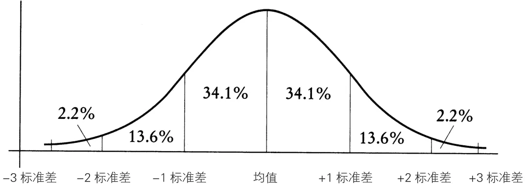 更进一步的研究表明,对于所有的正态分布曲线,95.4% 的数据落在以均值为中心、以 2 倍标准差数值为边界的区间内,99.7% 的数据落在以 3 倍标准差数值为边界的区间内。还是用刚才的那个案例来分析,95.4% 的人的智商值在 70 至 130,而 99.7% 的人的智商值在 55 至 145。