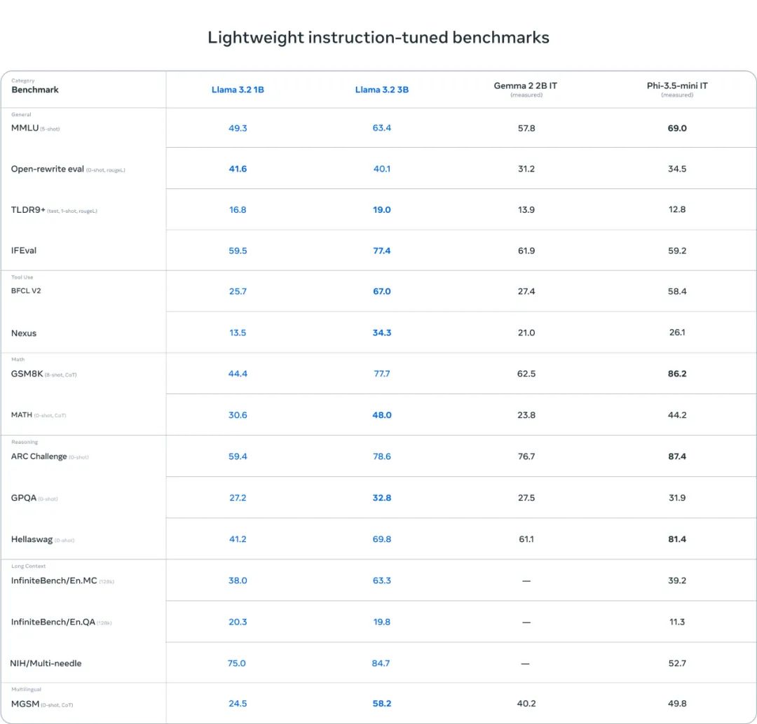 至于轻量级的 1B 和 3B 版本,则都是纯文本模型,但也具备多语言文本生成和工具调用能力。Meta 表示,这些模型可让开发者构建个性化的、在设备本地上运行的通用应用 —— 这类应用将具备很强的隐私性,因为数据无需离开设备。