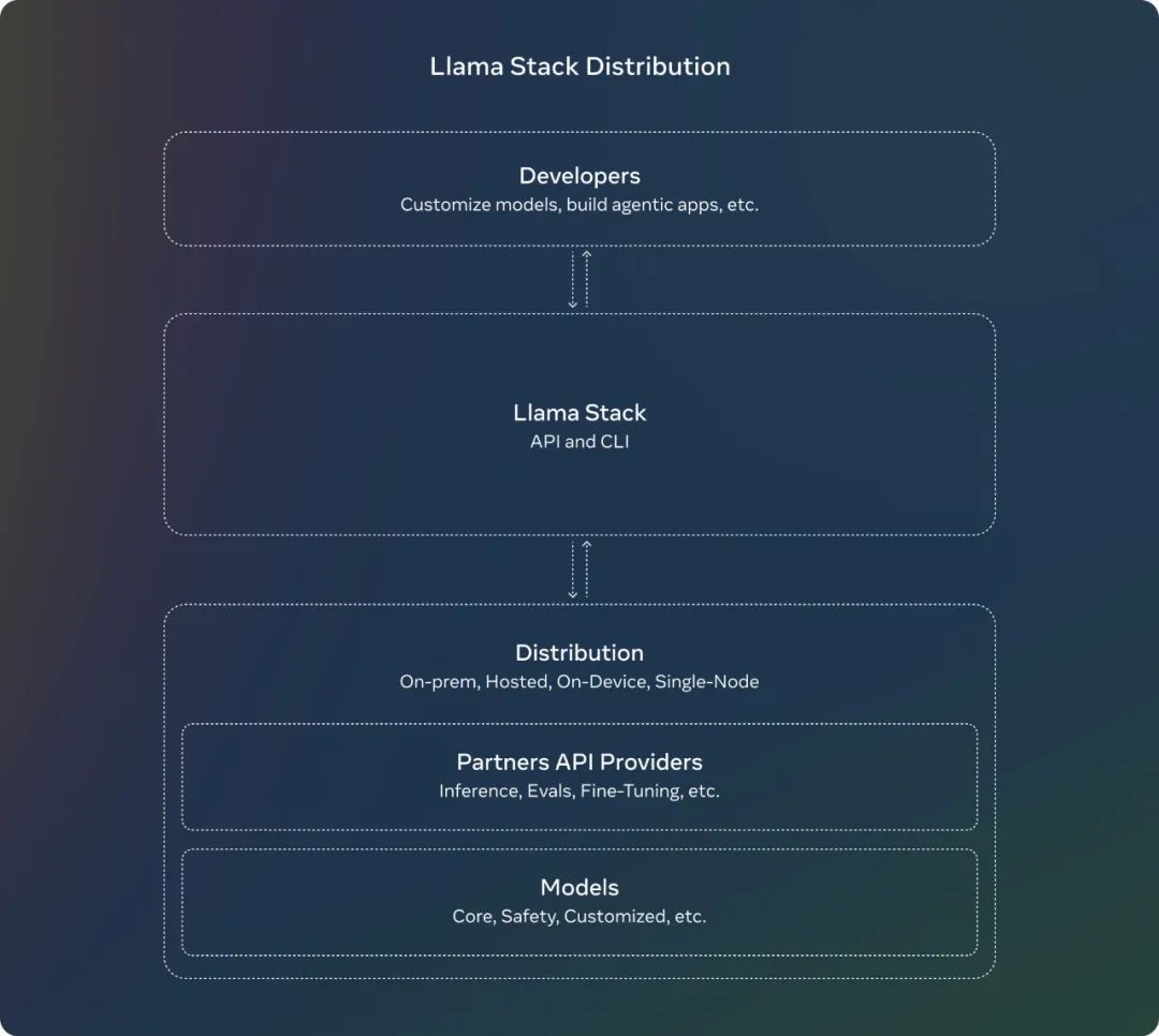 此外,Meta 还引入了 Llama Stack Distribution,作为一种将多个 API 提供者打包在一起的方式,以便为开发人员提供一个单一的端点。Meta 现在与社区分享一个简化和一致的体验,这将使开发者能够在多种环境中使用 Llama 模型,包括本地、云、单节点和设备上。