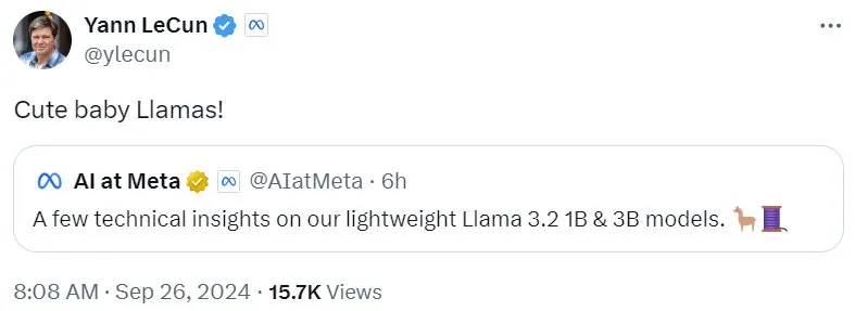 Meta 首席 AI 科学家 Yann LeCun 也欢快地表达了自己的喜悦:「乖宝宝羊驼!」