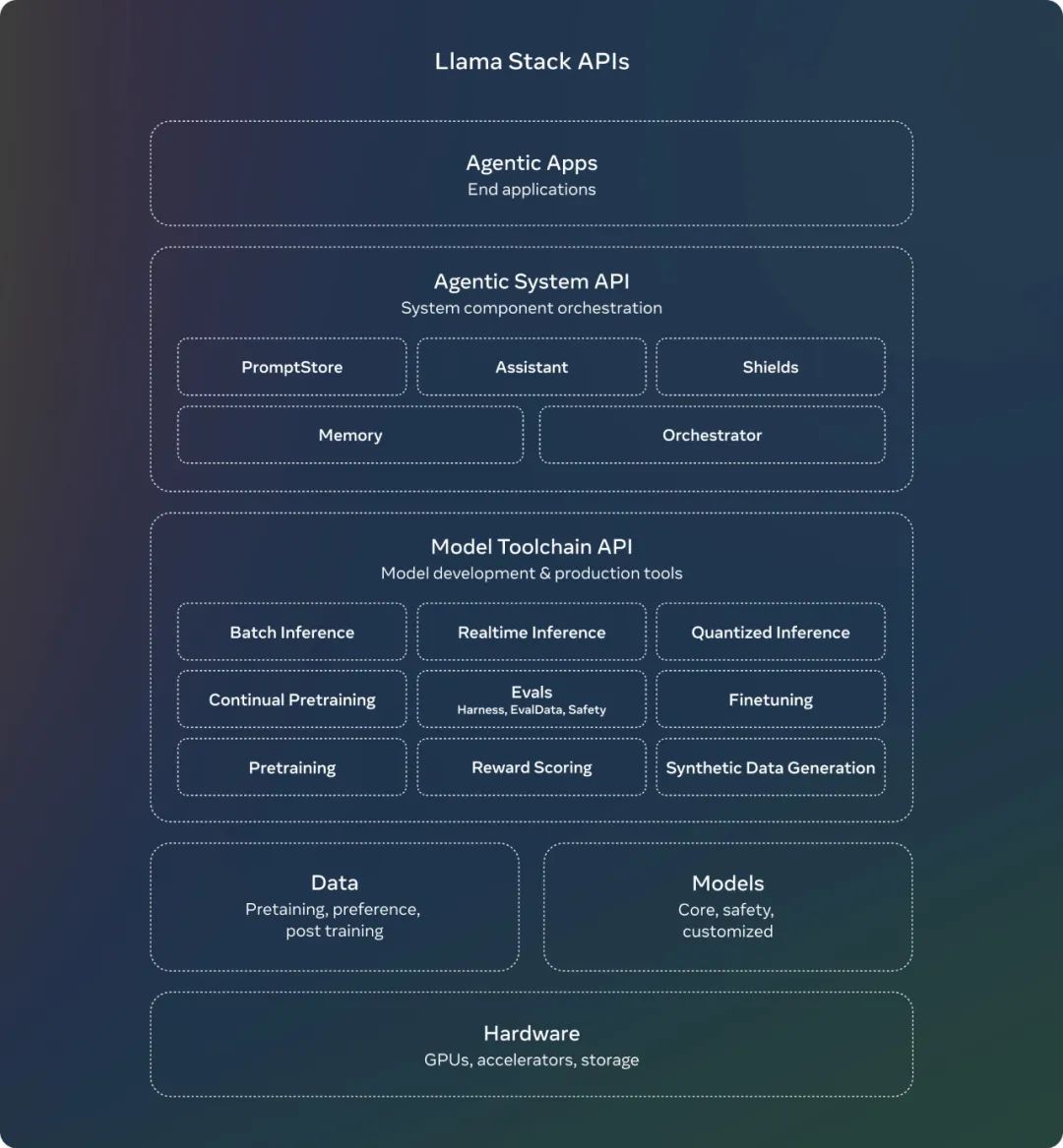 在七月份,Meta 就发布了 关于 Llama Stack API 的征求意见稿,这是一个标准化的接口,用于规范工具链组件(微调、合成数据生成)来定制 Llama 模型并构建代理应用程序。从那时起,Meta 一直在努力使 API 成为现实,并为推理、工具使用和 RAG 构建了 API 的参考实现。