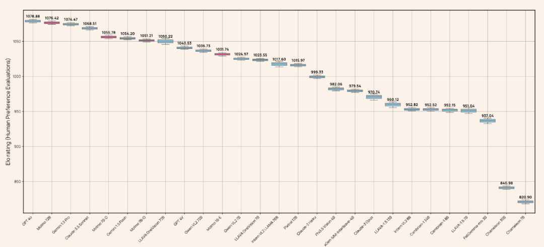 表现最好的 Molmo-72B 在学术基准上取得了最高分,但人类评估基准上则仅次于 GPT-4o,居于第二。