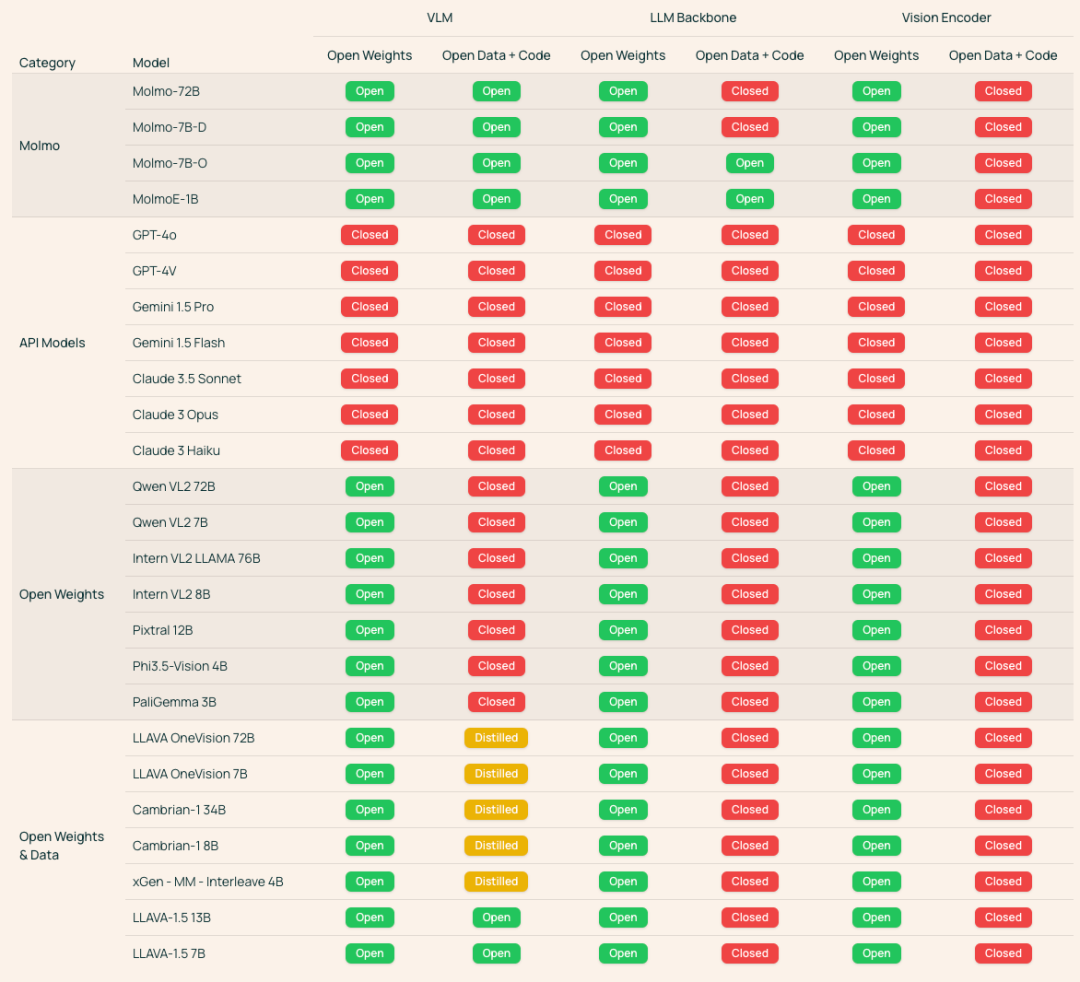 如上图所示,Ai2 的研究团队统计了目前 VLM 的开源程度,除了直接看模型的权重、数据和代码是否公开,他们还考虑了模型是否依赖于其他闭源模型。如果一个模型在训练中用了其他专有模型生成的数据,那它就被标记为「蒸馏」,这意味着它无法完全独立再现。