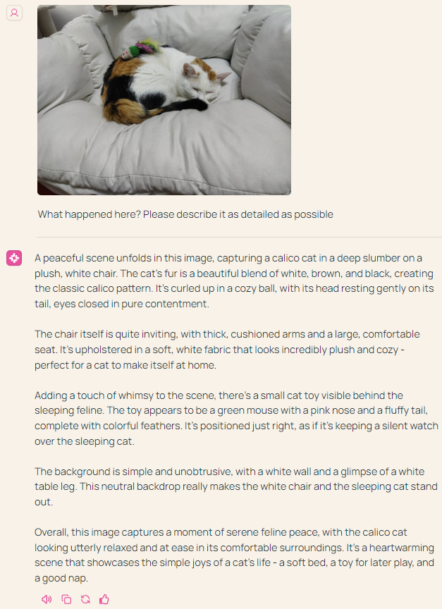 机器之心也尝试了一下他们在线发布的 Demo 模型。相较于宣传视频,其功能还很有限,所以我们让其执行了图像描述任务,可以看到 Molmo 在细节描述和准确度上的表现确实很不错,它甚至能注意到猫背上的小玩具:「玩具看起来像一只绿色的老鼠,鼻子是粉红色的,尾巴是蓬松的,羽毛色彩缤纷。」
