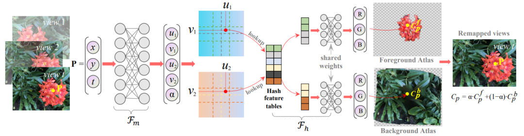 其中 CE 表示交叉熵损失,等式右侧第二项则鼓励和前景图集的稀疏性,这有助于前景和背景图集内容的明确分离。完成预训练后,可以通过监督图集重建视图来训练整个模型。但直接进行训练会导致背景图集中明显的区域遗漏,影响了后续的编辑任务。为了解决这个问题,本文引入了修补损失。具体而言,利用 ProPainter 模型对遮罩背景进行初步修补,生成一组新的修补视图。假设原始视图中的点 P 在修补视图中对应于,则重建损失可以表示如下: