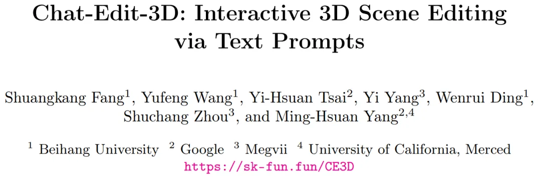论文《Chat Edit 3D: Interactive 3D Scene Editing via Text Prompts》的作者包括来自北京航空航天大学博士生方双康、北京航空航天大学副研究员王玉峰,谷歌AI技术主管Tsai Yi-Hsuan,旷视高级研究员杨弋,北京航空航天大学研究员丁文锐,旷视首席科学家周舒畅,加州大学默塞德分校和谷歌DeepMind研究科学家Yang Ming-Hsuan教授。