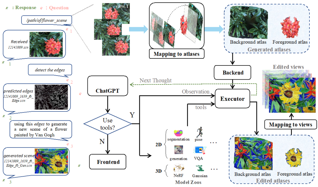 CE3D,即 Chat-Edit-3D。其核心思想是通过大规模语言模型解析用户的任意文本输入,并自主调用相应的视觉模型来完成 3D 场景的编辑。为了实现任意视觉模型的集成,本文先设计 Hash-Atlas 的映射网络,将对 3D 场景的编辑转换为对 2D 空间内的图集编辑操作,从而实现了 2D 多视角编辑与 3D 场景重建过程的完全解耦,因此,本文将无需固定的 3D 表示形式和 2D 编辑方法。用户想用什么视觉模型就可以用什么视觉模型。