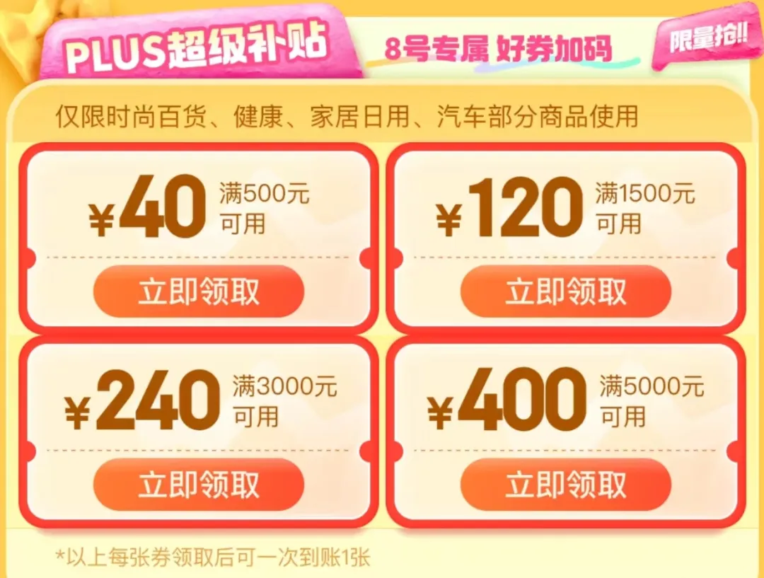 同时可领60元额外补贴(200-20*3),全场通用。购买200元出头的商品相当于9折,这个券可以说是必领的。
