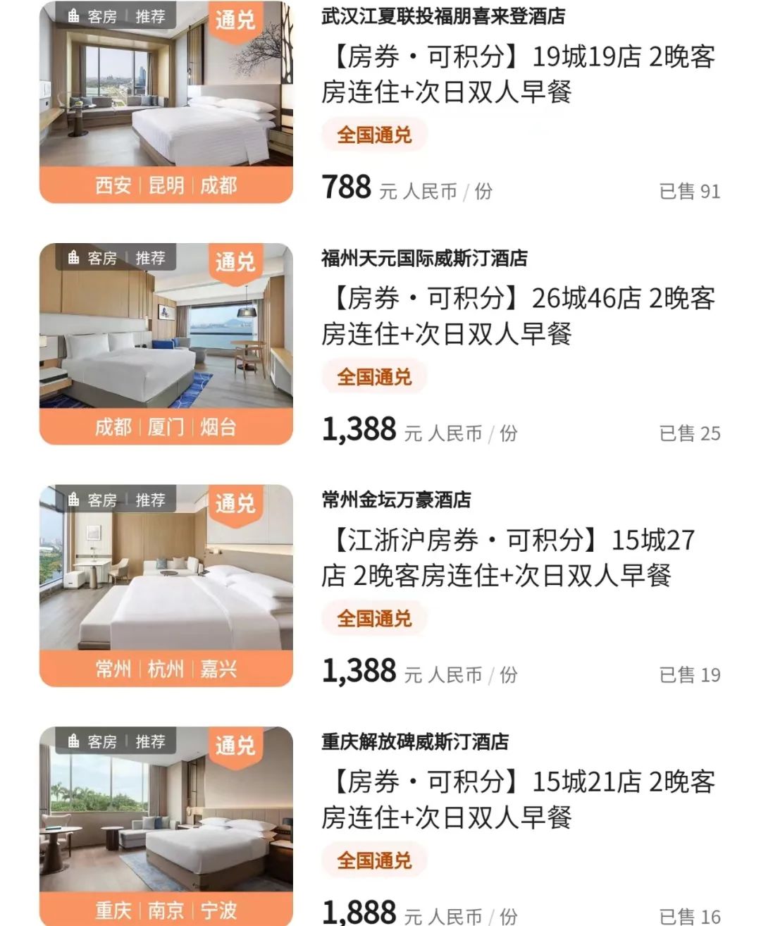 例如全国19城19店2晚套餐含双早,788元