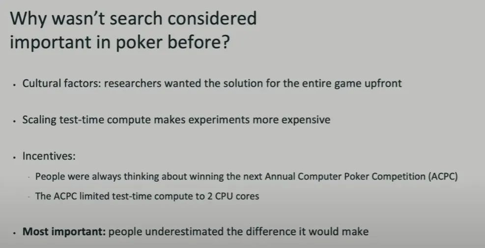 人们没有很好的动力去有效地探索这些方法,因为当时的竞赛设置难以支撑这些方法(比如可用算力低,要求每一手牌必须在短时间内完成)。