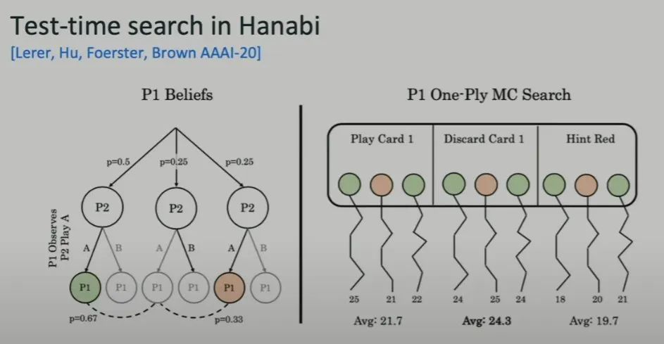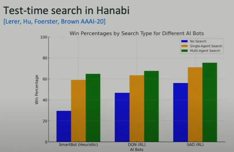 这一巨大提升甚至让 Brown 及其团队一度怀疑实验出 bug 了。要知道 Hanabi 游戏本质上不可能取得 100% 胜率,经过搜索加持的强化学习神经网络的胜率可能趋近于饱和。